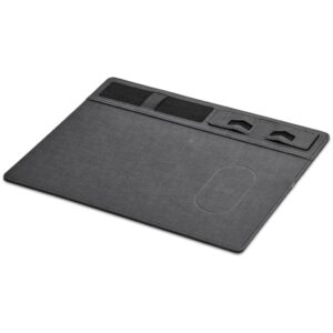 Add style and function to your work surface with this extended mouse pad. It features a wireless charger, a pen holder and a phone stand.