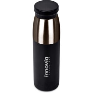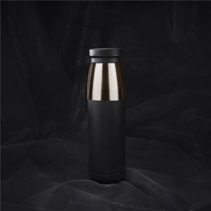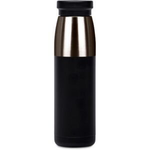 A strikingly elegant vacuum water bottle which will keep your liquids hot or cold for hours. Combination finish of powder coated black and shiny gun metal.
