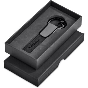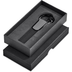 The Alex Varga collection presents a selection of understatedly elegant keyholders featuring gun metal finish zinc alloy parts, combined with a textured PU. The loop strap of this keyholder can be laser branded for a subtle tone-on-tone effect.