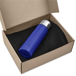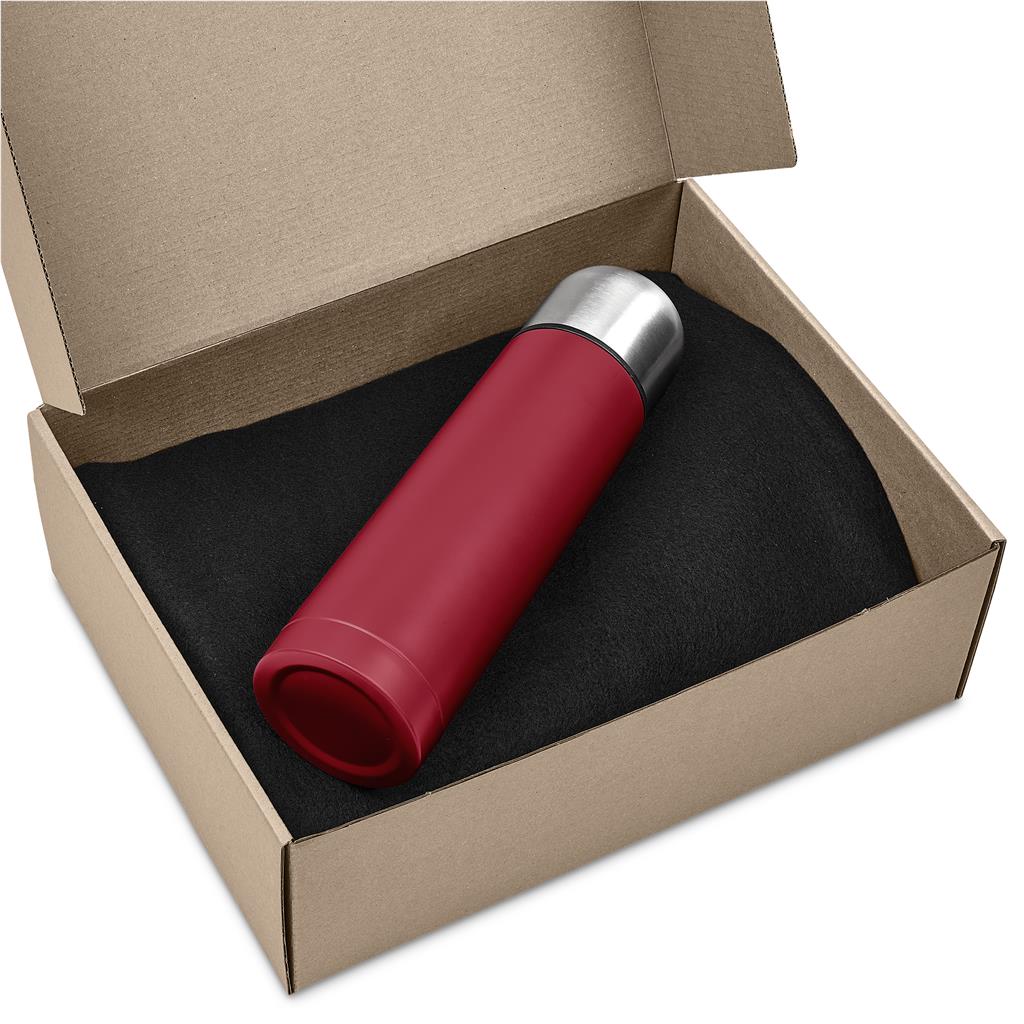 A 500ml stainless steel vacuum flask is paired with a black fleece blanket in a kraft gift box.