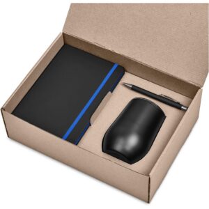 A double-wall tumbler, an A5 notebook with a strap closure and a metal ball pen are neatly presented together in a gift box. The pen has a soft, matte finish and reveals a matte, light grey finish when lasered. This set is suitable as a client gift, or for staff and onboarding of new members to the team. A pre-packaged gift set not only looks impressive, but can also be a convenient and practical option when it comes to transport and delivery.