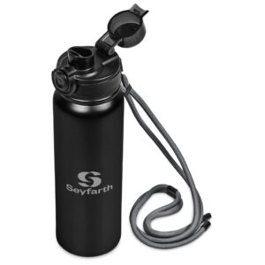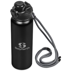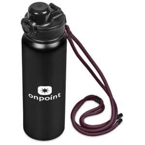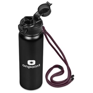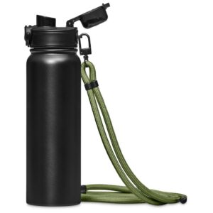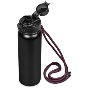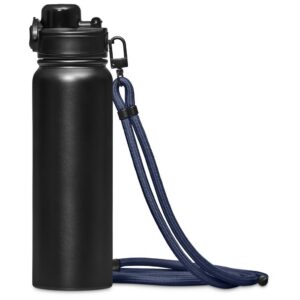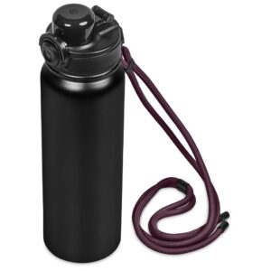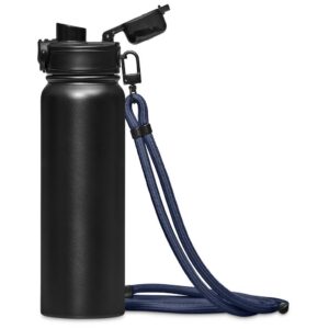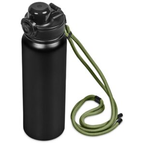 The innovative swig or sip lid design of this water bottle gives you two drinking options: hold it upright to sip through the built-in straw, or tilt back to swig through the drinking port opening. The lid also has a clip-lock mechanism to keep it watertight when not in use, but easy to pop open when you need to hydrate. Unscrewing the lid from the base reveals a wide mouth, which makes it easy to load ice or fruit into your water. The adjustable, clip-on crossbody strap enables you to carry your bottle hands-free. The bottle base is made from strong and durable BPA-free stainless steel with a black powder-coated finish. It has a double-wall vacuum construction, which ensures that liquids inside stay hot or cold for hours.