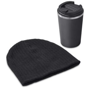 A comfy beanie is supplied packed inside a stainless steel vacuum tumbler with a secure, screw-on lid, which will keep liquids hot for hours.