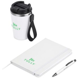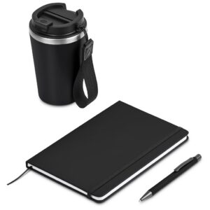 A stainless steel & plastic double-wall tumbler with a secure, screw-on lid and an optional carry loop is combined with an A5 hard cover notebook and a metal ball pen in a kraft gift box. The pen has a soft, matte finish and reveals a matte, light grey finish when lasered. This set is suitable as a client gift, or for staff and onboarding of new members to the team. A pre-packaged gift set not only looks impressive, but can also be a convenient and practical option when it comes to transport and delivery.