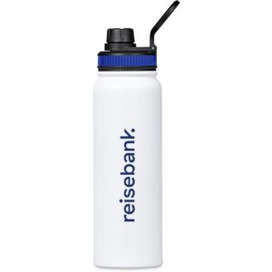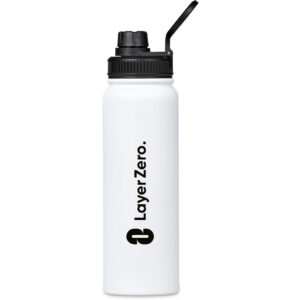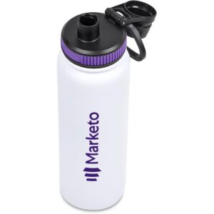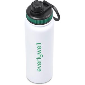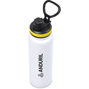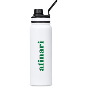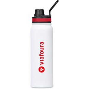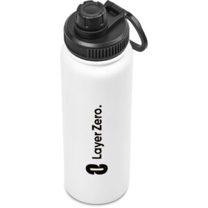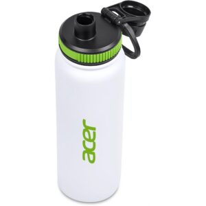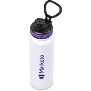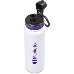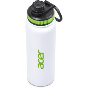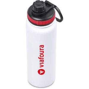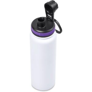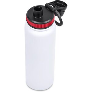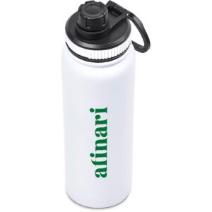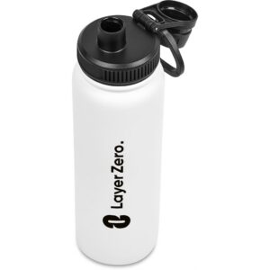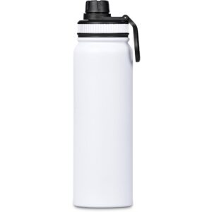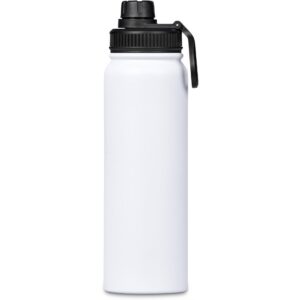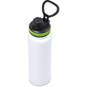 The bottle base is made from strong and durable BPA-free stainless steel with a white powder-coated finish. It has a double-wall vacuum construction, which ensures that liquids inside stay hot or cold for hours.