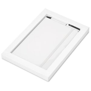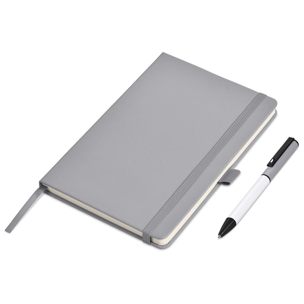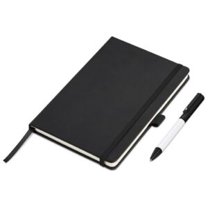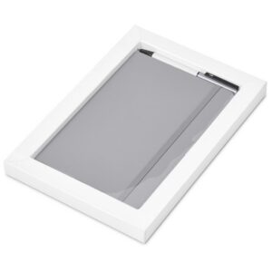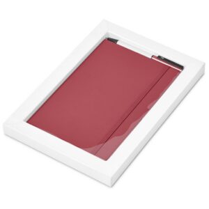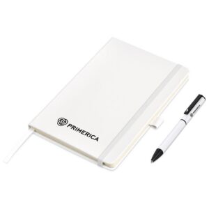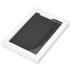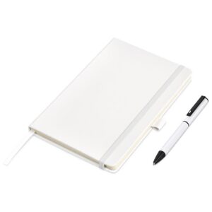 An aluminium twist ball pen is packaged together with the popular Stanford Notebook in a box with a firm cardboard base and an acetate lid. The glossy white barrel of the pen matches nicely with the box frame, and the transparent lid provides bright and clear exposure for your branding.
