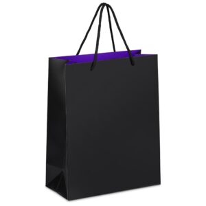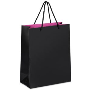 The bold, vibrant inner colour adds a striking touch of celebratory colour, beautifully contrasted by the matte black exterior. Designed with sturdy black cord handles and a reinforced baseboard, the bag offers both style and durability.