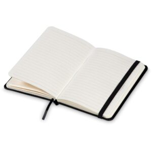 Classic design hard cover notebook with black vinyl cover, ribbon, and elastic closure.