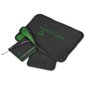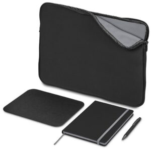 An A5 notebook, a metal ball pen and a mouse pad are supplied in a matching neoprene laptop sleeve, to create a useful set of everyday essential items for work or studying. The laptop sleeve is manufactured in South Africa. Should there not be sufficient stock currently available for your requirements, then please keep in mind that more stock can be manufactured and made available within approximately 2 weeks.