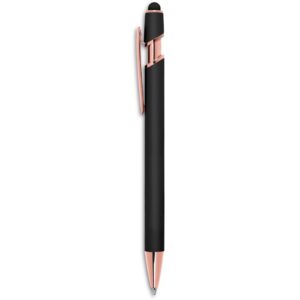 Made from aluminium, with a rubberised finish and shiny rose gold trims, this ball pen also features a rubber stylus for use with touchscreen devices. Beneath the surface of the barrel is a rose gold underlay, so when a logo is lasered on the barrel, a shiny rose gold finish is revealed, which matches the trims of the pen.