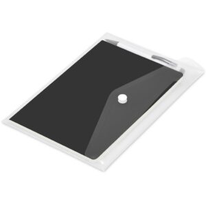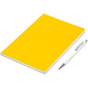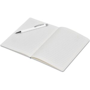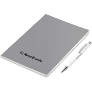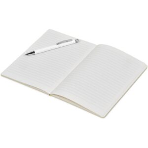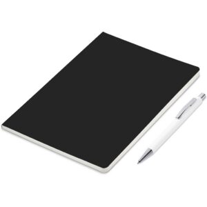 An economical notebook and pen set, especially suited for meetings, conferences and events. Packaging the notebook and pen in a pouch makes it easy to transport and to distribute these writing sets. This set consists of a white pen with an A5 notebook available in a variety of colours. The pouch has a stud button closure, and it’s made predominantly from recycled material.