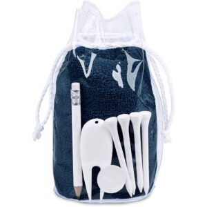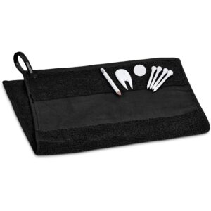 This neatly packaged golf set is a great gift for golf days. It includes a 400g/m2 cotton golf towel, mini pencil with eraser, divot tool, ball marker and four golf tees.