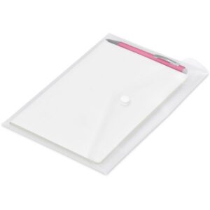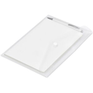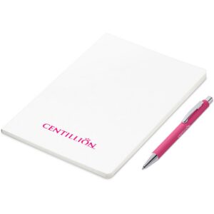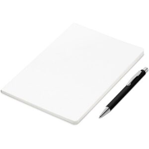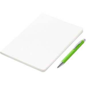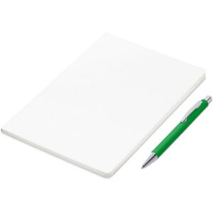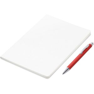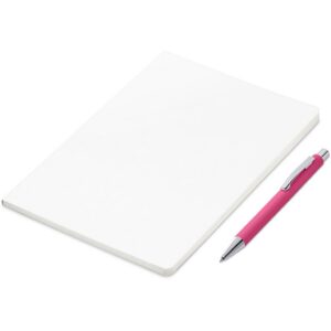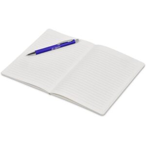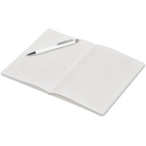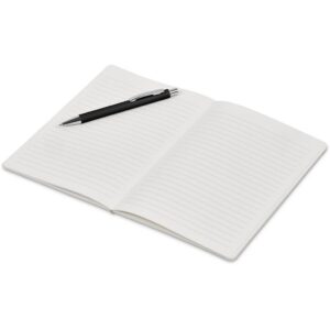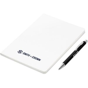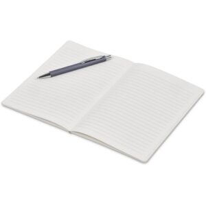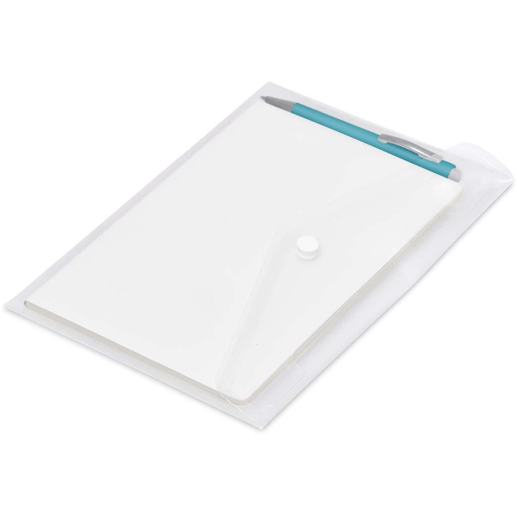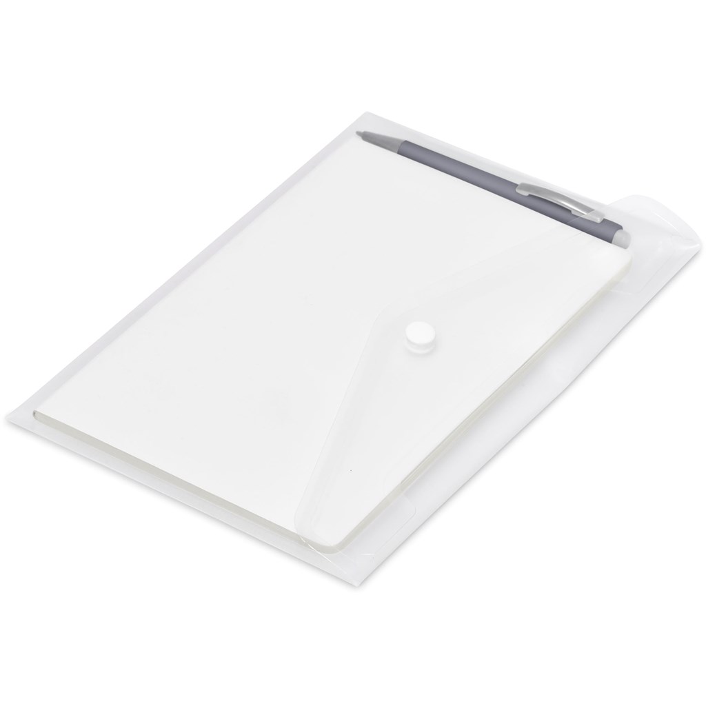 An economical notebook and pen set, especially suited for meetings, conferences and events. Packaging the notebook and pen in a pouch makes it easy to transport and to distribute these writing sets. This set consists of a white A5 notebook with a pen available in a variety of colours. The pouch has a stud button closure, and it’s made predominantly from recycled material.