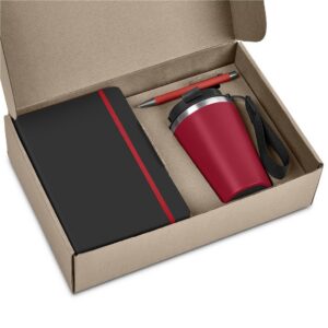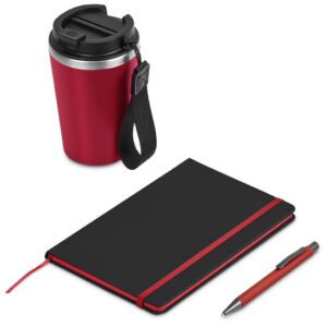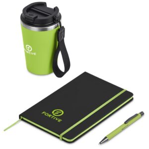A stainless steel & plastic double-wall tumbler with a secure, screw-on lid and an optional carry loop is combined with an A5 hard cover notebook and a metal ball pen in a kraft gift box. The pen has a soft, matte finish and reveals a matte, light grey finish when lasered. This set is suitable as a client gift, or for staff and onboarding of new members to the team. A pre-packaged gift set not only looks impressive, but can also be a convenient and practical option when it comes to transport and delivery.