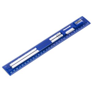 This clever and compact stationery set features a 30cm ruler with 2 pencils, an eraser and a sharpener.
