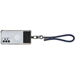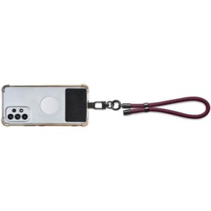 The patch fits between the phone and a phone case, with a loop popping out of the charger port opening of the case. The loop can then be attached to the clip of the strap. The strap can be adjusted to a length and fit that’s comfortable for you.