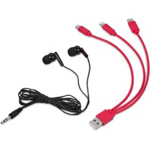 A pair of wired earbuds and a 3-in-1 charging cable are packaged together in a small, zippered pouch. The cable is suitable for all types of phones, and can charge multiple devices at the same time.