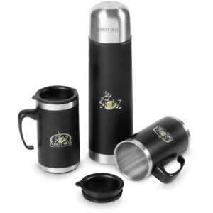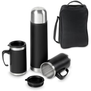 A perfect travel or outdoor gift. Double walled flask with an easy pour button release which auto closes when lid is closed. BPA free. Includes 2 x stainless steel mugs with PP lid and handle. Comes in a black pouch with carry handle. BPA free. Branding on both flask and mugs. Branding can be done on all three components.