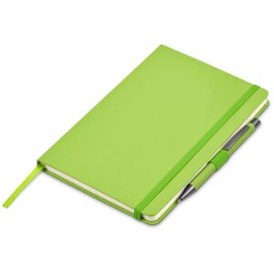 A popular A5 hard cover notebook is paired with a popular metal ball pen in a black, 2-piece, solid gift box.