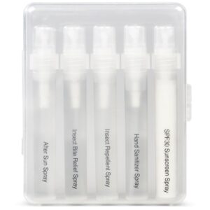 Take this clever and compact kit with you when travelling, camping, picnicking, or hiking. It features 5 useful sprays, securely packed together in a durable transparent case.