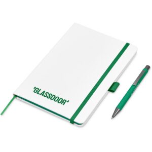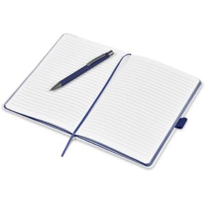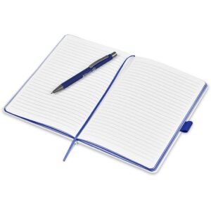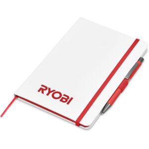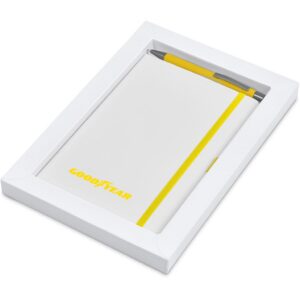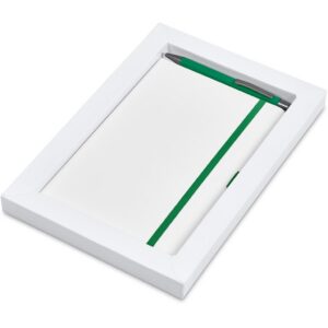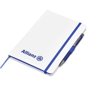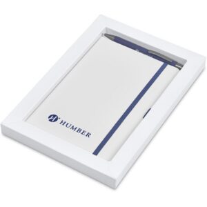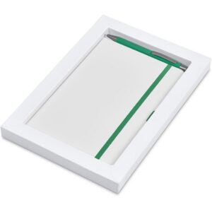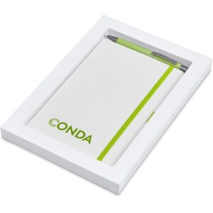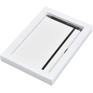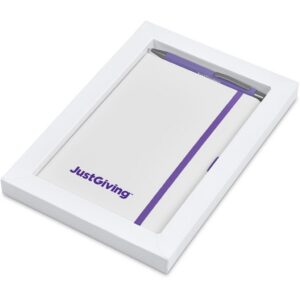 The matching matte textures of this notebook and pen, combined with the colour accents, makes them perfect partners. The set is packaged together in a box with a firm cardboard base and a transparent acetate lid, which provides bright and clear exposure for your branding.