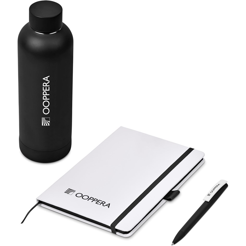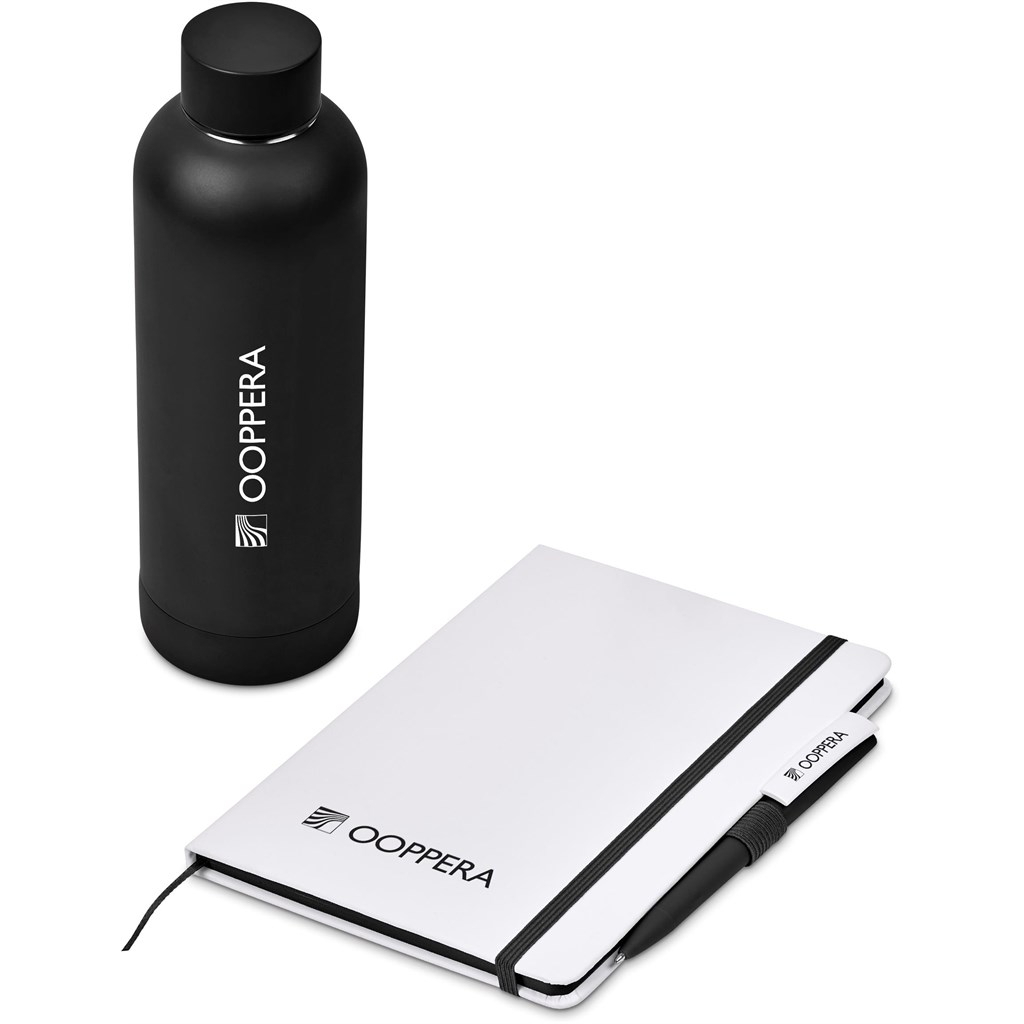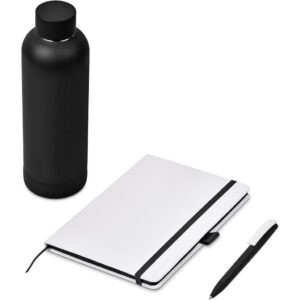 A recycled stainless steel bottle, an A5 notebook with coloured page edges, and a soft-touch barrel plastic ball pen are neatly presented together in a gift box. This set is suitable as a client gift, or for staff and onboarding of new members to the team. A pre-packaged gift set not only looks impressive, but can also be a convenient and practical option when it comes to transport and delivery.