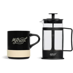 Made from high-quality A-Grade ceramic, the black mug in this set has a silicone band, which accentuates branding that matches the band colour. It’s combined with a black coffee plunger, ideal for making a single cup of coffee.