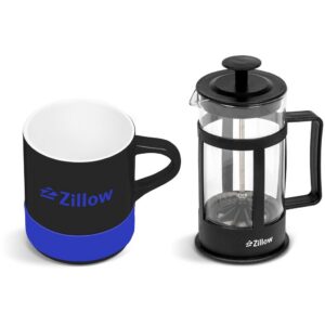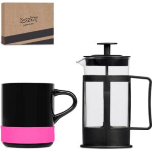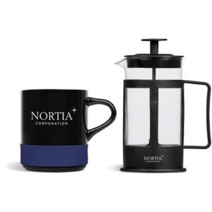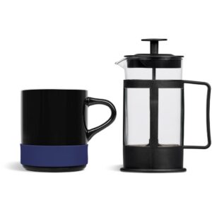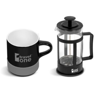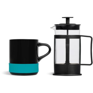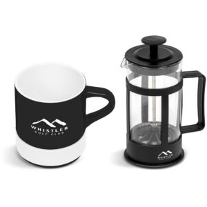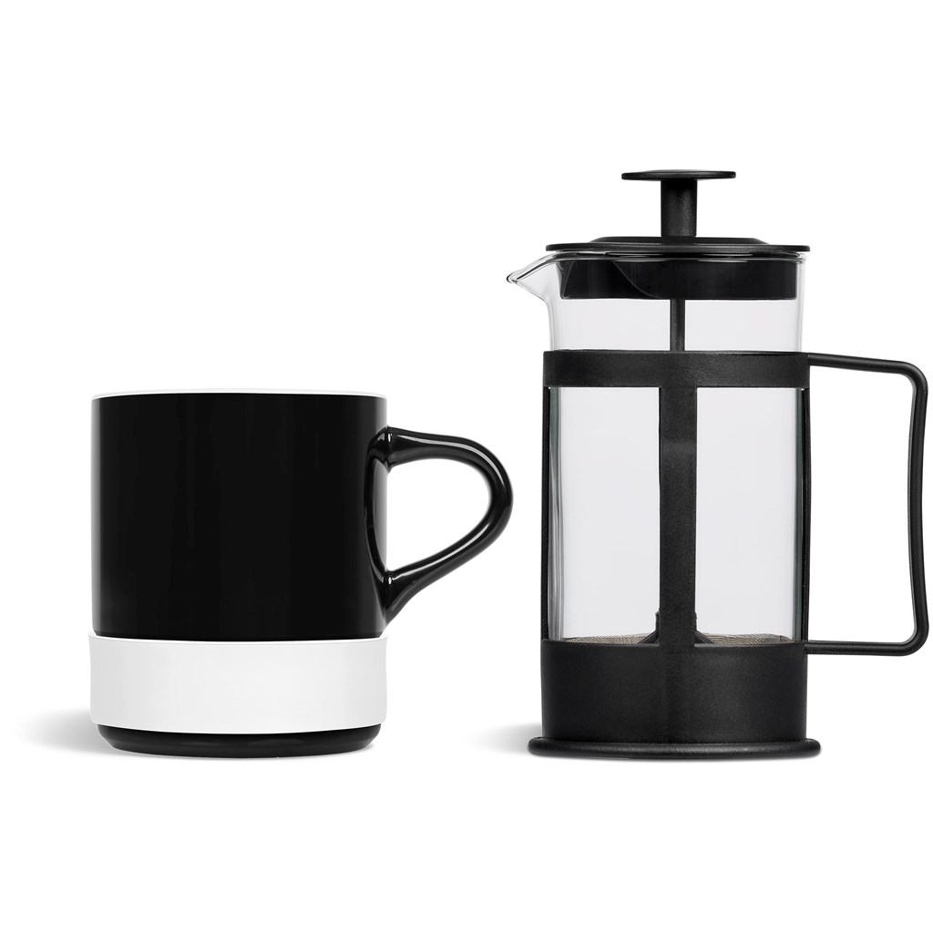 Made from high-quality A-Grade ceramic, the black mug in this set has a silicone band, which accentuates branding that matches the band colour. It’s combined with a black coffee plunger, ideal for making a single cup of coffee.