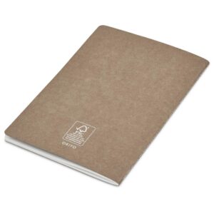 The white FSC logo printed on the back cover of the notebook is printed during manufacture. The branding method necessary to print a logo on the front cover is different, and printing in white is susceptible to dye migration. White logo branding is therefore not offered on the coloured notebooks and is only available on the natural notebooks.