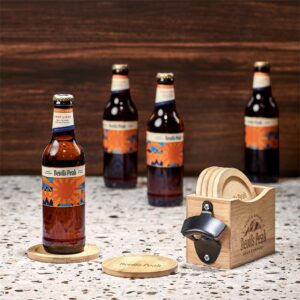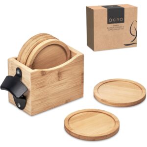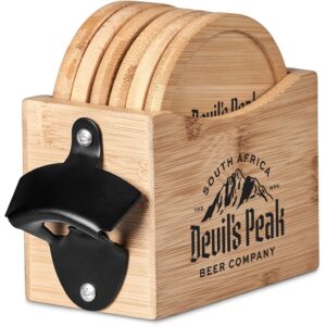 A set of six bamboo coasters in a bamboo container with a steel bottle opener. Bamboo is a strong and solid material, and is highly sustainable, because of the rapid pace at which it grows.