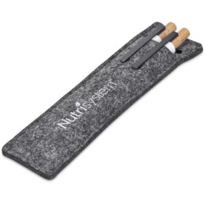 The barrels of this ball pen and pencil are made from recycled aluminium, and the pushers from bamboo. They’re packaged together in a felt pouch made from recycled single-use plastic bottles. One side of the barrels is reserved for the branding of your logo or message, while the opposite side is pre-branded with a recycled aluminium icon. The back of the pouch is pre-branded with a recycled PET icon.