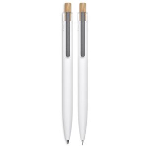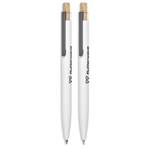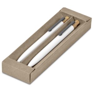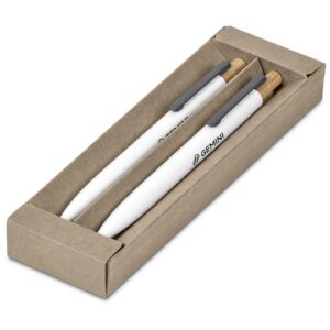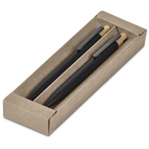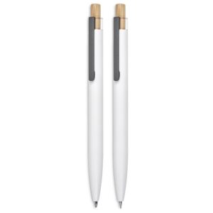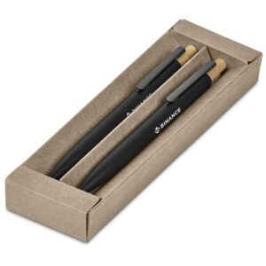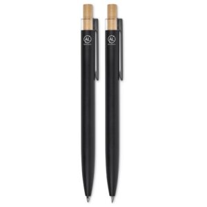 The barrels of this ball pen and pencil are made from recycled aluminium, and the pushers from bamboo. They’re packaged together in a slider-style natural kraft paper presentation box. One side of the barrels is reserved for the branding of your logo or message, while the opposite side is pre-branded with a recycled aluminium icon.