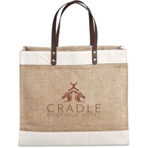 Okiyo Reza Jute & Cotton Tote with leather handles. A structured, large tote made from strong, heavy-duty natural fabric, with leather shoulder straps.