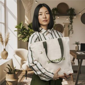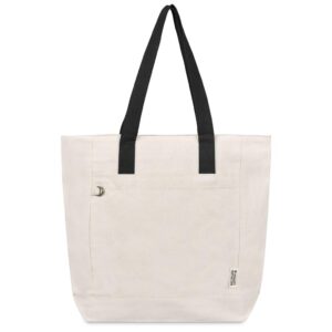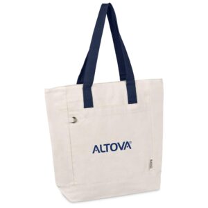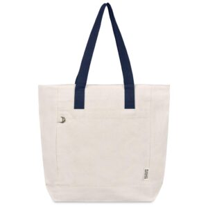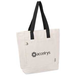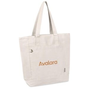 Make a sustainable impression at your next conference with this eco-friendly recycled cotton tote. It features a secure zipped main compartment and a practical front pocket, making it both stylish and functional.