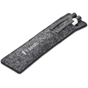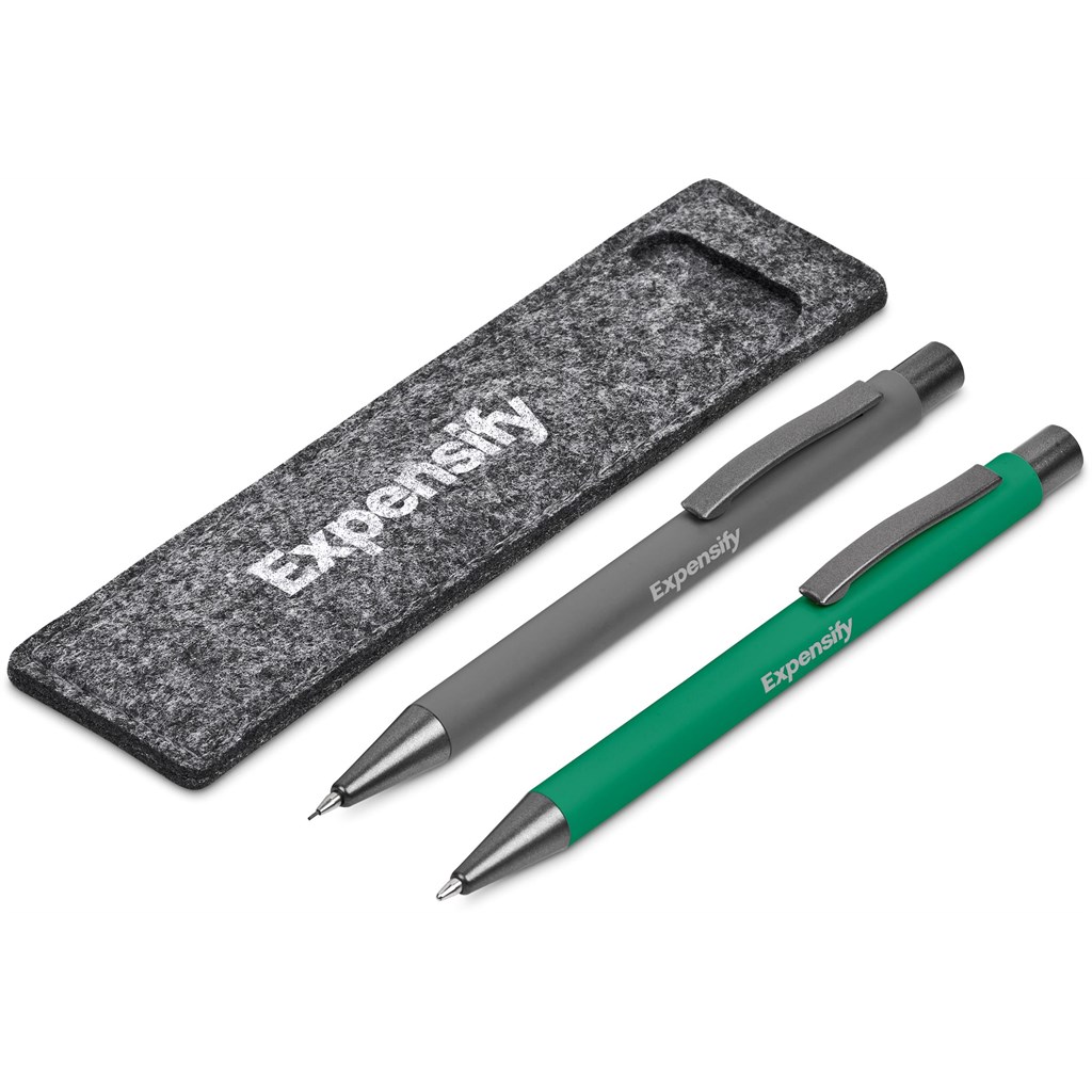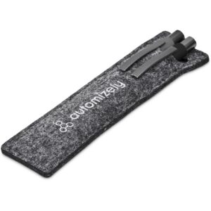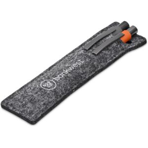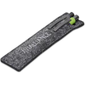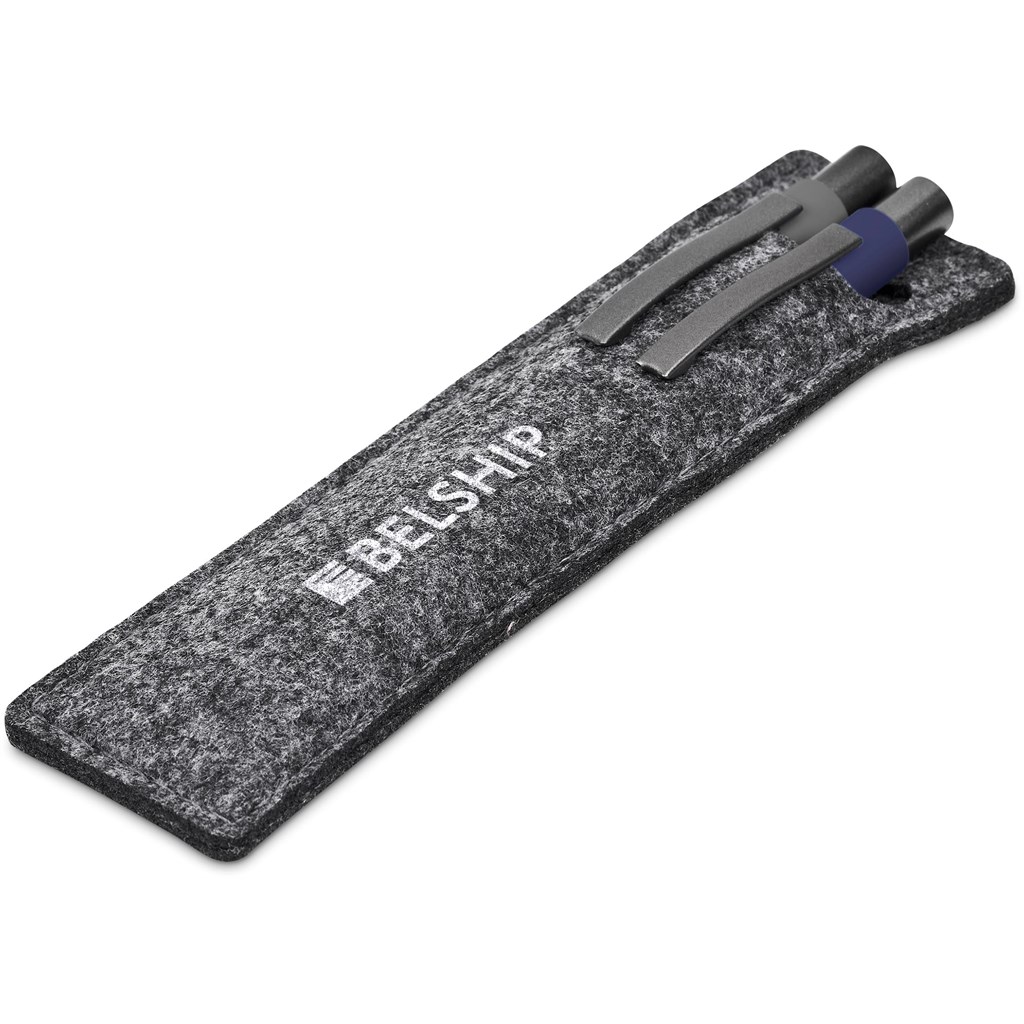 A grey metal pencil and a metal pen in a choice of colours are paired together in a grey pouch made from RPET felt. Laser engraving on the rubberised finish barrel of the pen and the pencil provides a clean, precise effect which is both subtle and visible. The ball pen refill contains good quality, black German ink and will provide smooth, uninterrupted writing for a minimum of 1,500 metres. The pencil is fitted with break-resistant 0.5mm lead. A set with a different colour pen and pencil makes it easier to instantly identify which is the pen and which is the pencil.
