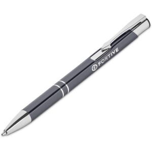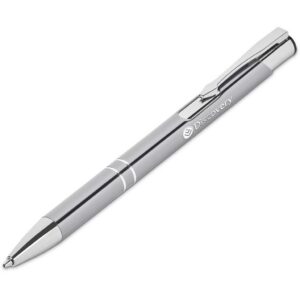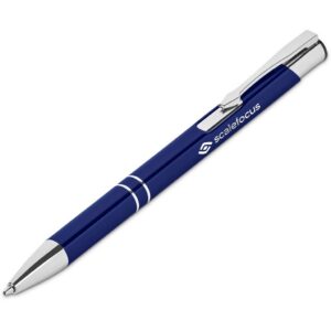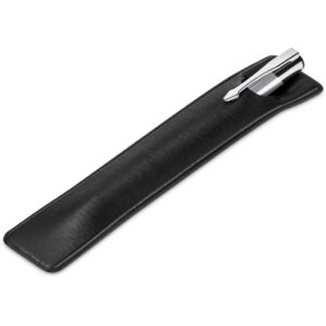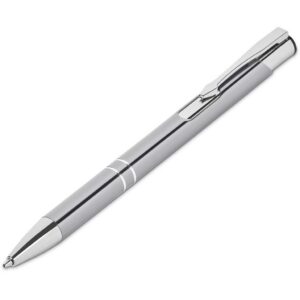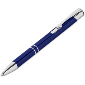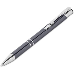 A retractable aluminium ball pen with a shiny anodised, coloured barrel and shiny chrome accents is presented in a black pen pouch. It contains a good quality German black ink refill, with a writing distance of 1,500 metres.