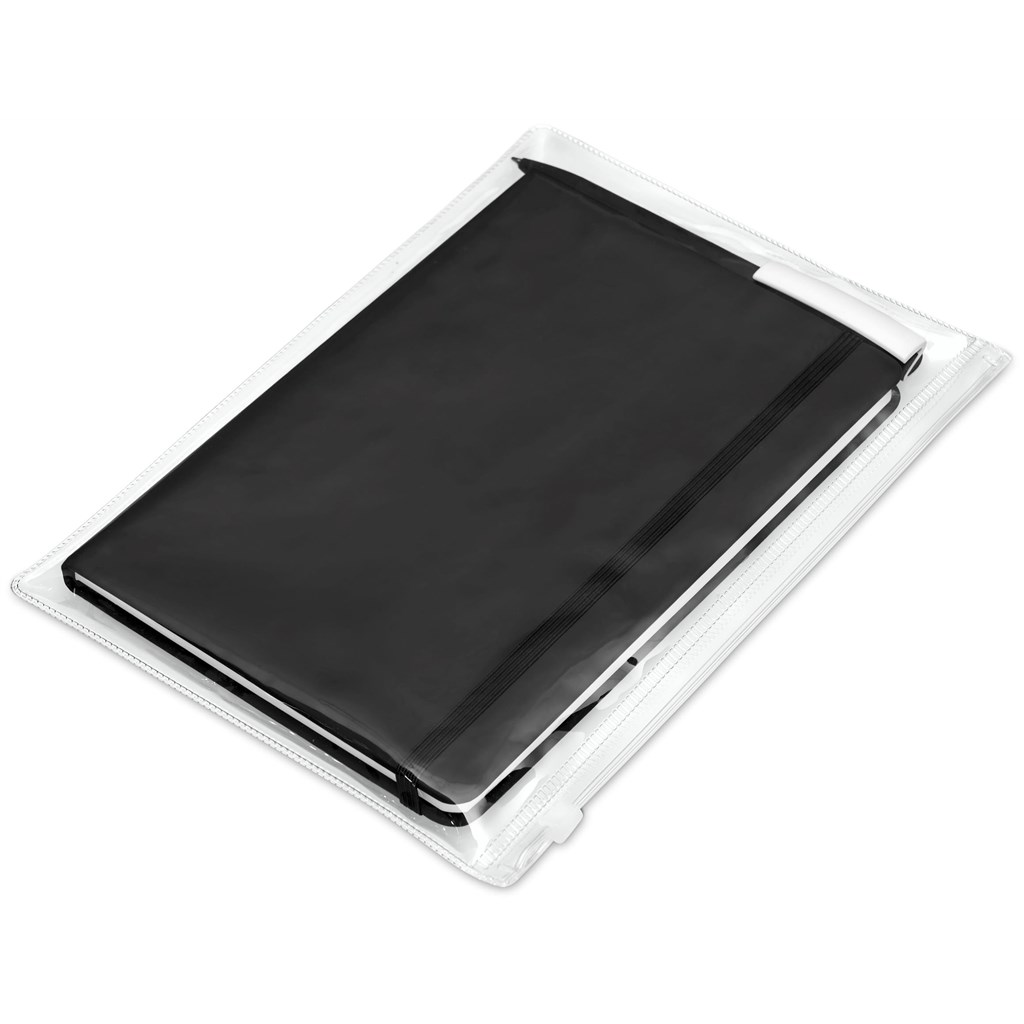 The matching matte textures of this notebook and pen, combined with the white accents, make them perfect partners. The pouch is made from good quality PVC, and has a ziplock closure. It’s tactile and durable, and can be reused for storing folded documents, cards, notes and other odds ‘n ends.