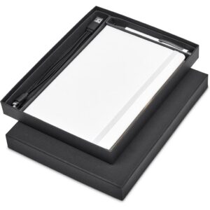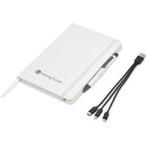 An A5 hard cover notebook, a metal ball pen and a black 3-in-1 charging cable are combined in a black, 2-piece presentation box.