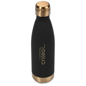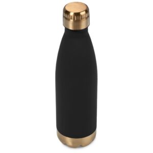 The double-wall vacuum construction of this 500ml bottle will keep liquids hot or cold for hours. This bottle has a rubberised black finish and a gold colour lid and base, which gives it the perfect balance between fashion and function.