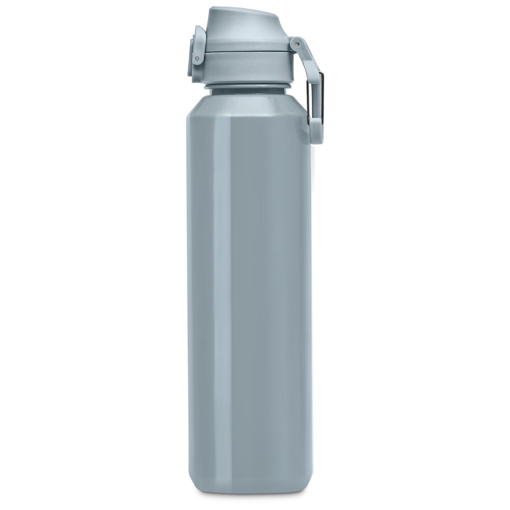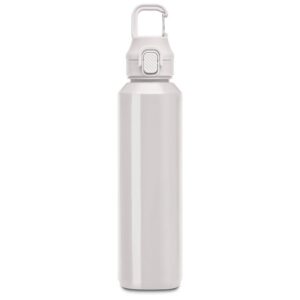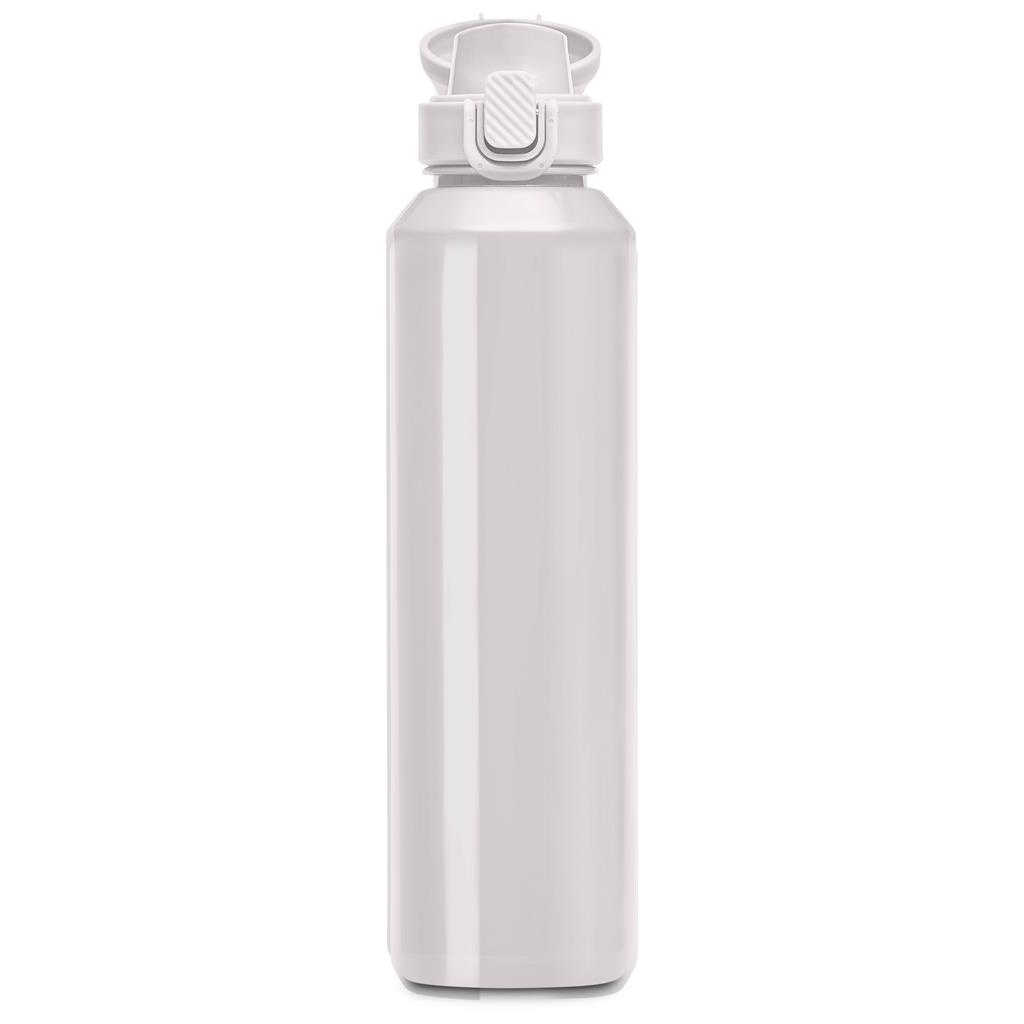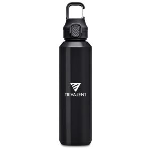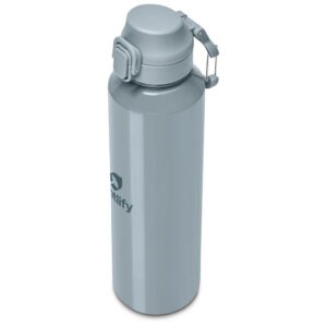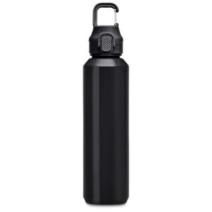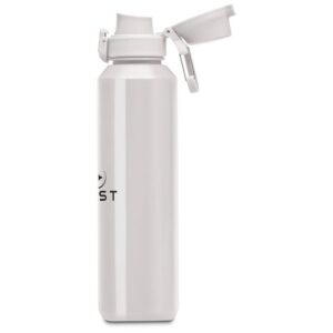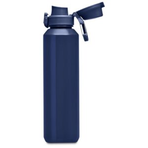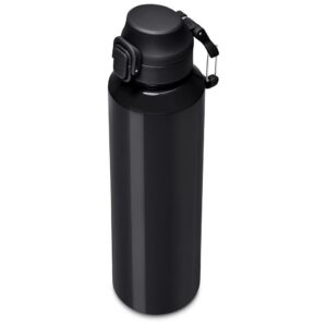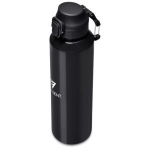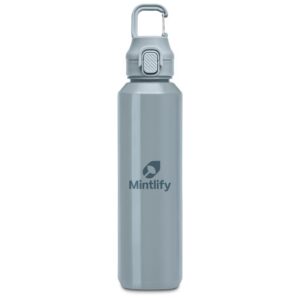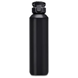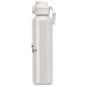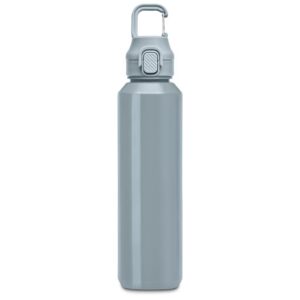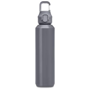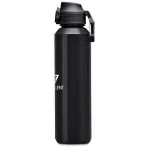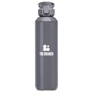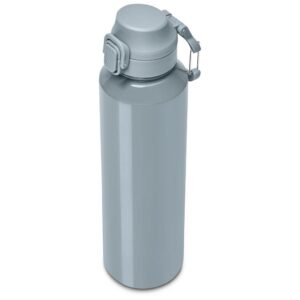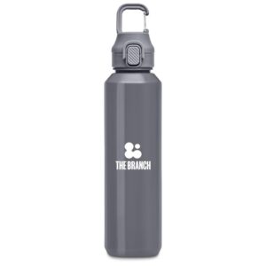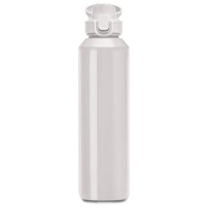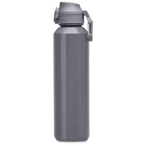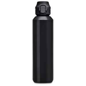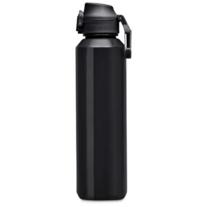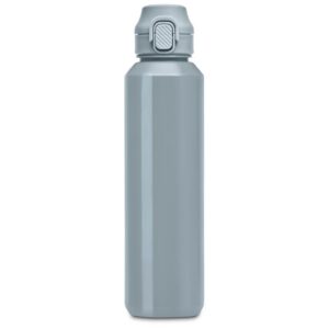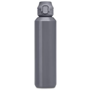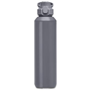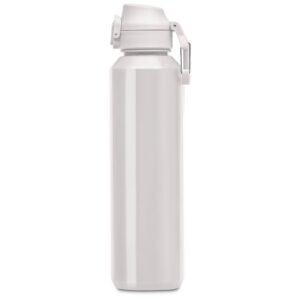The body of this water bottle is made from BPA-free, food-grade recycled single-use plastic. It’s lightweight and easy to carry, and you can clip it onto your bag with the included clip attachment. The lid features a lock mechanism to keep it securely closed and a flip-top button to easily open the lid when you need a drink.