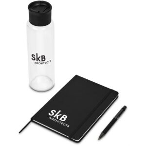 A glass water bottle, a notebook and a metal ball pen are neatly presented together in a gift box. This set is suitable as a client gift, or for staff and onboarding of new members to the team. A pre-packaged gift set not only looks impressive, but can also be a convenient and practical option when it comes to transport and delivery.