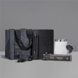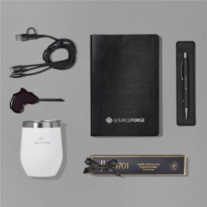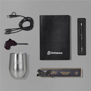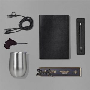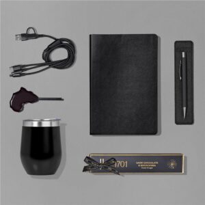 Indulge in sophistication with our Class & Charm Hamper! This classy collection features a stylish tumbler, a sleek notebook, a premium pen, and a fast charge cable—everything you need to stay organized and on-trend. Paired with delightful edibles, it is a gift that brings a touch of elegance to everyday moments.